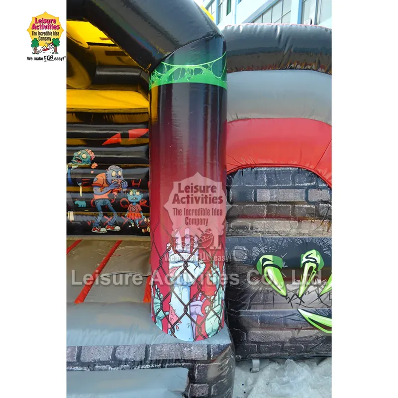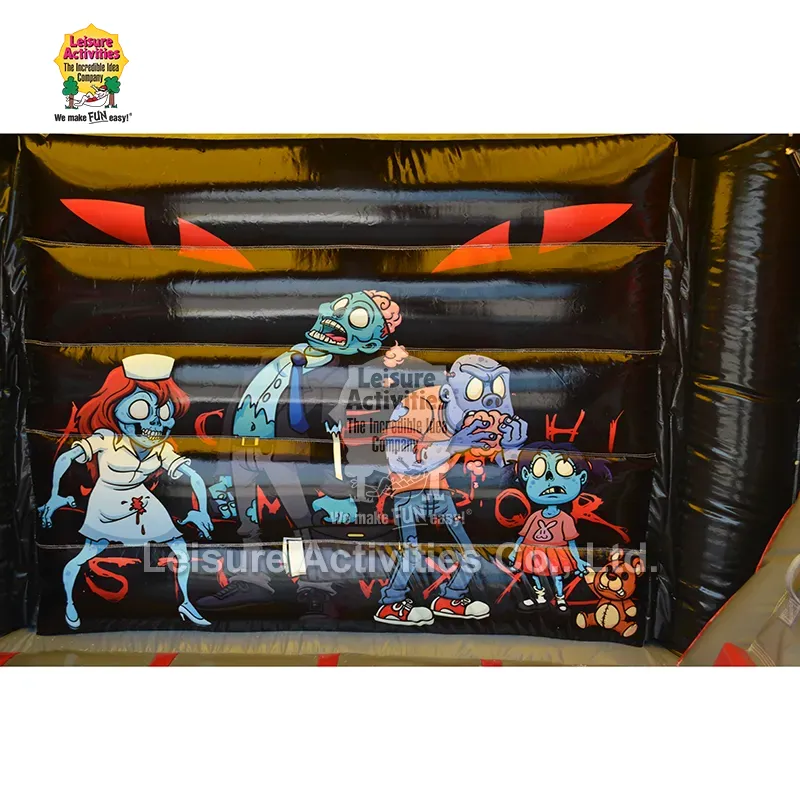 Невеликі надувні надувні замки з привидами з гіркою: ця комбінована надувна модель з привидами на тему зомбі створена, щоб захопити дітей своєю захоплюючою естетикою мультфільмів жахів. Сміливе поєднання яскравих червоних, глянцевих чорних і моторошних зелених і синіх кольорів створює яскраве, захоплююче середовище. Великі грайливі зображення мультяшних зомбі в динамічних позах, як-от медсестра, персонаж, що поїдає мозок, і дитина-зомбі з ведмедиком, радше веселять, ніж лякають. Інтерактивні елементи, як-от великий блакитний зомбі, що повзає по даху, кігтисті руки, що прориваються крізь стіни, і ланцюги/графіки на колонах викликають творчу гру уяви. Закрита конструкція із захисною верхньою кришкою забезпечує захист від тіні та легкого дощу, а закрита гірка додає пригод. Висота 10 футів робить його універсальним для використання як у приміщенні, так і на відкритому повітрі, ідеально підходить для вечірок на Хелловін, осінніх фестивалів, тематичних днів народження та моторошних розваг у дворі.