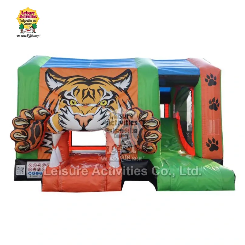Leisure Activities® є професійним виробником і постачальником надувних виробів у Китаї. Standard Inflatable Multiplay Tiger Bouncy Castles — це надувний замок на тему тигра, який поєднує в собі функції стрибків, лазіння та ковзання. Він має зелений лайм і помаранчевий як основні кольори, з 3D декором тигра на вході. Його можна швидко налаштувати всього за 10 хвилин.